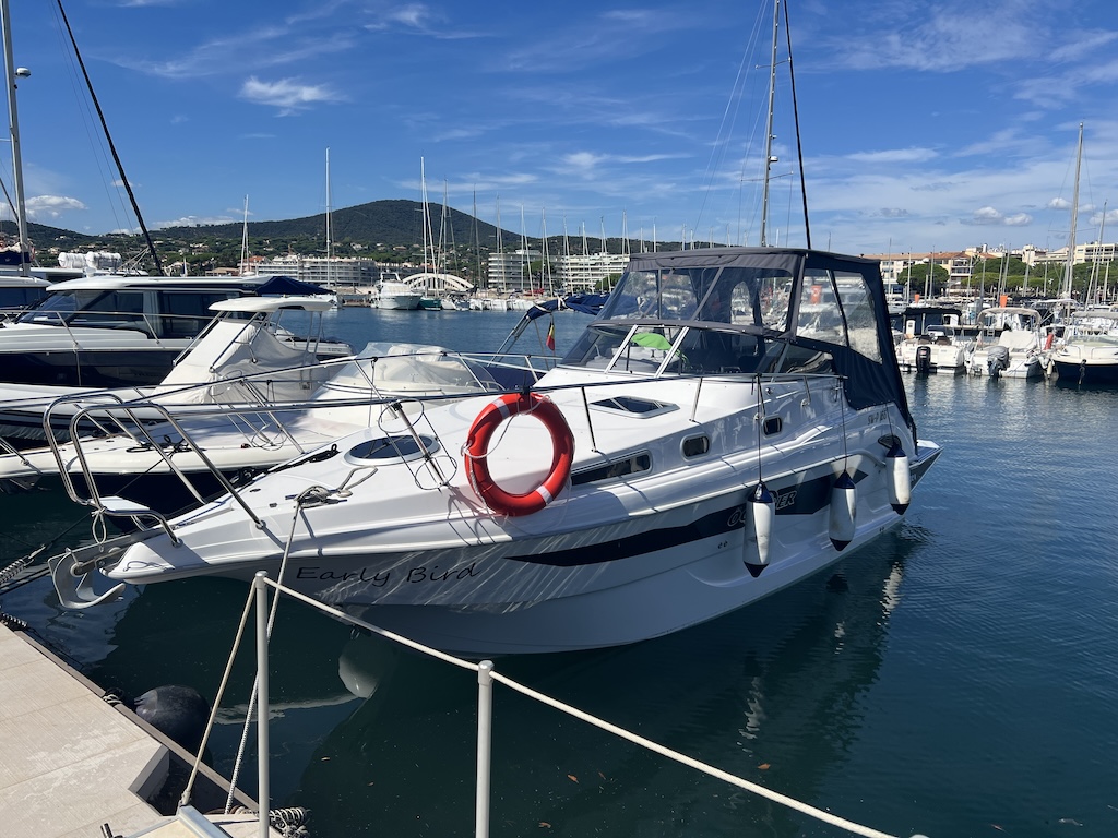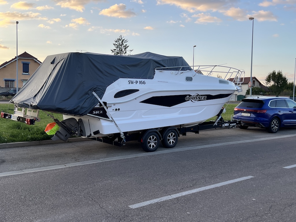 In Spätsommer haben wir die SRX30 -Yachtline- mit an die Cote d´Azur genommen und für 3 Wochen in den Hafen von Saint Maxime gelegt.  Die lange Tour  – ca. 1.100 km – ließ sich angenehm und sicher mit dem speziellen Öchsner-Trailer bewältigen. In Saint Maxime wurde dann das Boot zu Wasser gekrant.