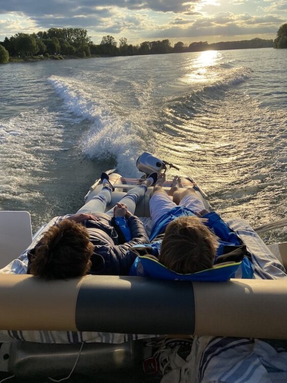 Im Touring-Paket ist unter anderem das bequeme Bugliegepolster, ein Sonnensegel, sowie ein Sonnenschutz für die Seite enthalten.